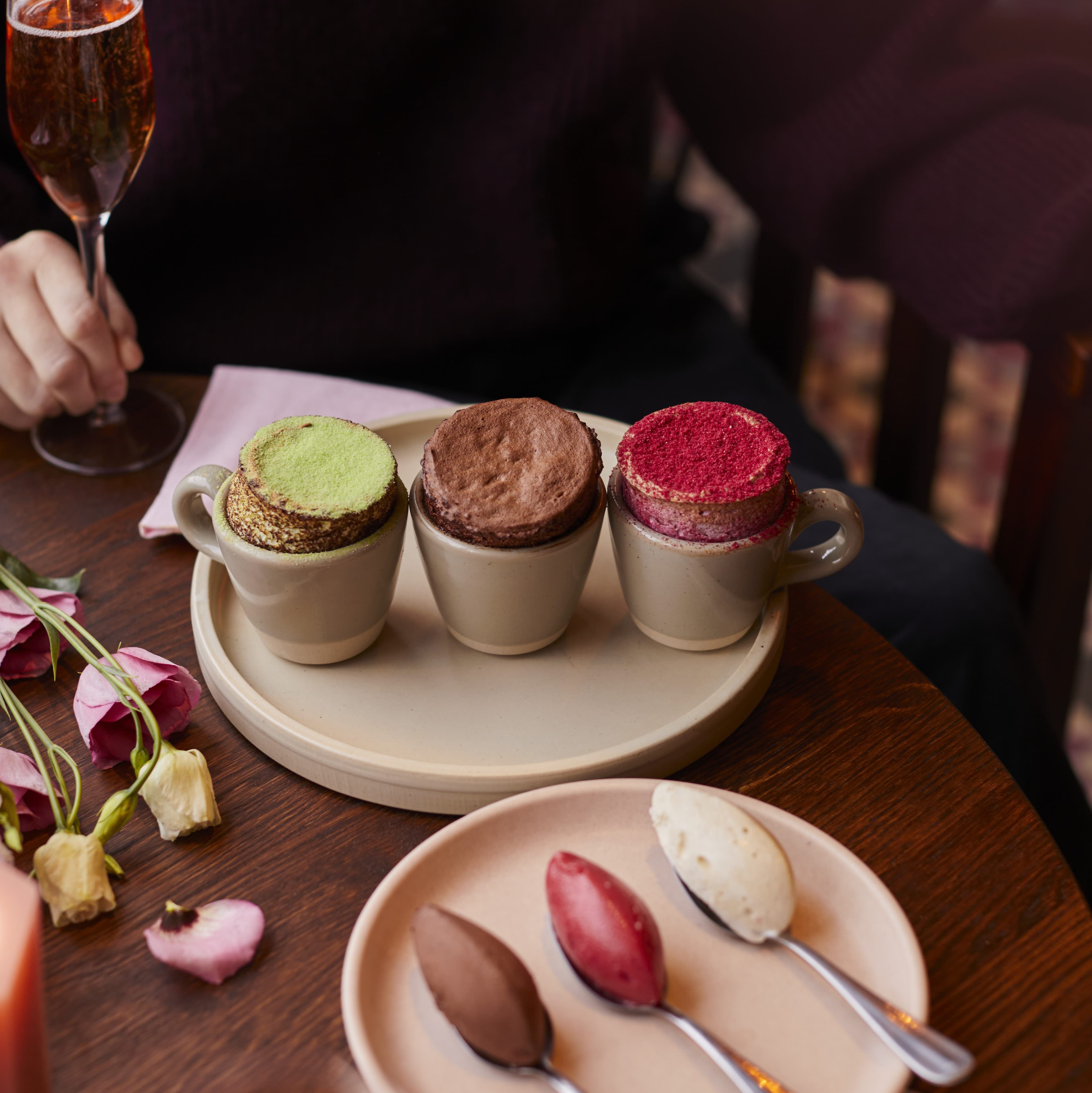 A sweet trio of pistachio, raspberry, and chocolate soufflés, served with Jude’s vanilla and chocolate ice creams plus raspberry sorbet. A treat to swoon over! (£9.95)