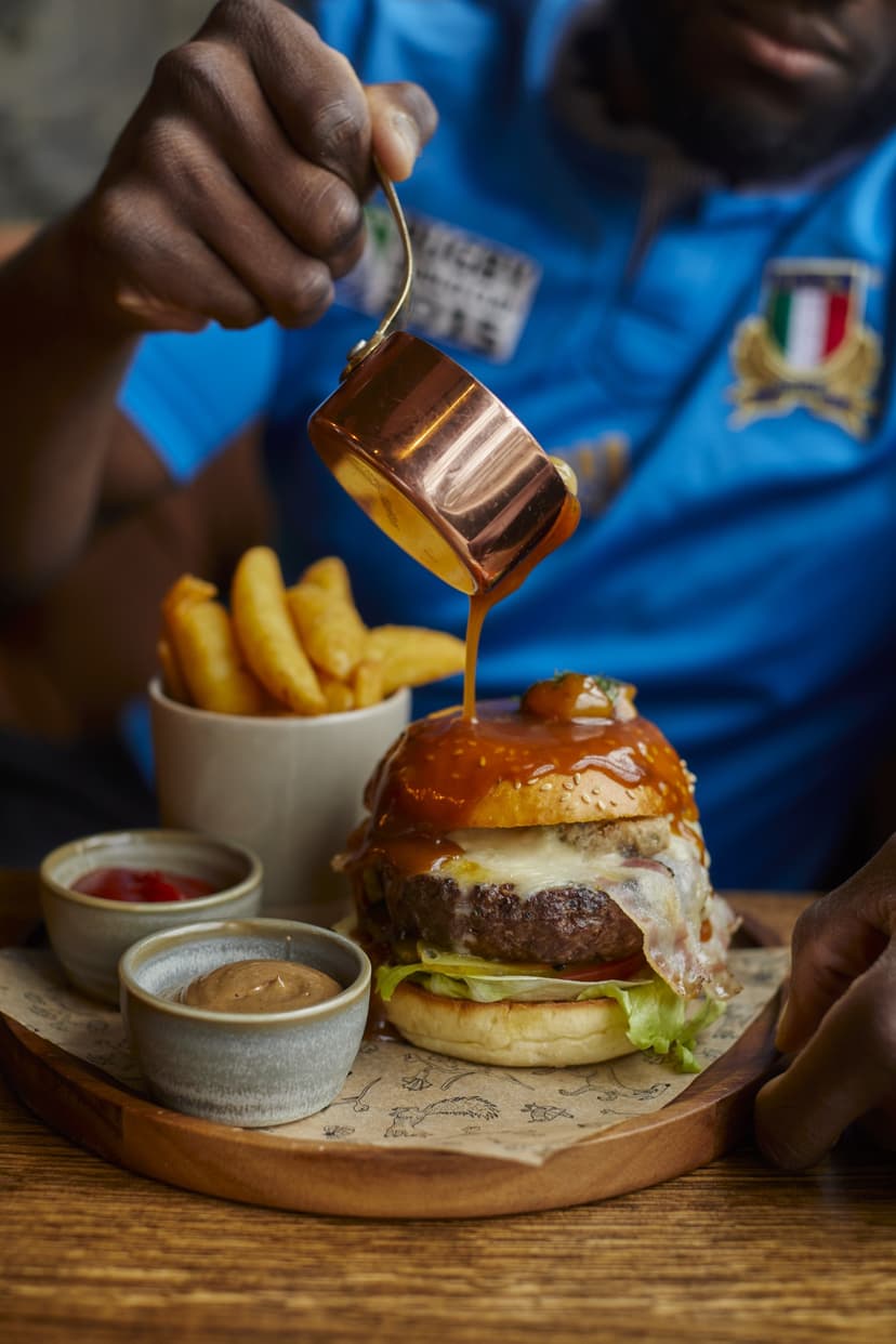 Only available on matchdays, our award-winning beef burgers come in a sesame brioche bun with garlic mayonnaise and pickles and are served with triple-cooked chunky chips, harissa ketchup, black garlic mayonnaise and a rich lardon gravy.